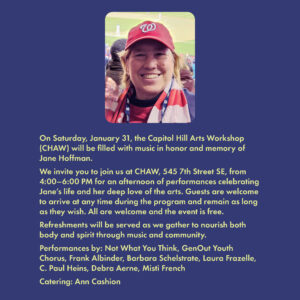 On Saturday, January 31, the Capitol Hill Arts Workshop (CHAW) will be filled with music in honor and memory of Jane Hoffman.